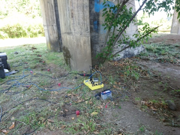 Syncrona ha realizado el servicio para conocer la forma y profundidad en una cepa de un paso sobre nivel. La tipología de la fundación estudiada en este caso particular fue una fundación superficial de 5 metros de largo y 2 metros de profundidad, en cuya parte inferior habían sido hincados pilotes al suelo y adosados al dado de fundación. En la figura 1 se muestra la configuración de adquisición adoptada, y los resultados obtenidos de la forma y tamaño de la fundación en la figura 2 y 3.