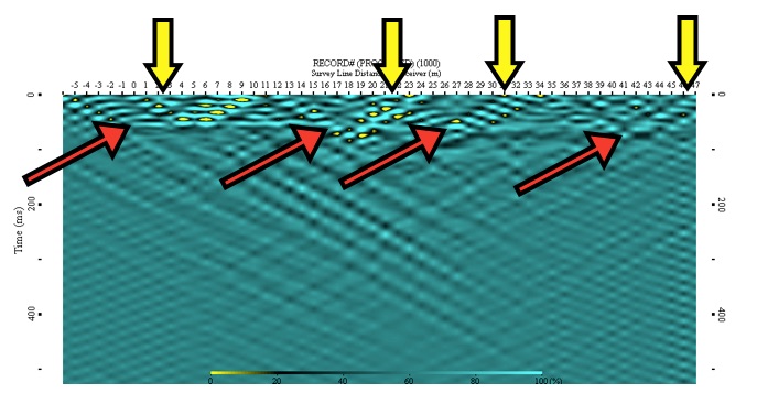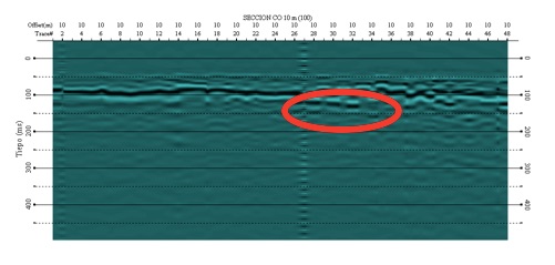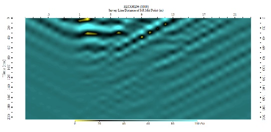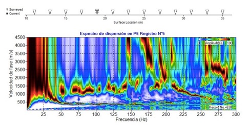 Paralelamente, los mismos datos adquiridos para generar la sección de Vs 2D se utilizan para analizar la difracción de ondas en reverso las cuales muestran las ondas difractadas por elementos enterrados que tienen dimensiones comparables a las longitudes de onda analizadas.