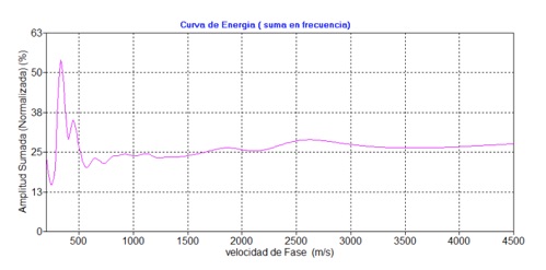 Este proceso de sumatoria en el eje de la frecuencia se ilustra en la figura 3. Los valores peak observados de Vs y Vp de la roca en la curva de sumatoria de amplitudes, indican que la velocidad de corte del suelo es Vs suelo = 350 m/s (figura 1) y las posibles velocidades de la roca son Vp roca = 2500 m/s y Vs roca = 1400 m/s. (figura 2)