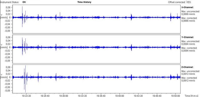 - Modo eventos, permite el registrar sólo la información importante para evaluar un evento vibratorio. El sistema permite definir un nivel de disparo (trigger) a partir del cual almacena los valores de vibración. Además permite definir 2 niveles de alarma que puede ser utilizados para envío automático de mensajes vía SMS o email. Los valores de alarma pueden ser configurados en función de los valores definidos en normativas internacionales de evaluación de vibraciones en estructuras o edificios, como por ejemplo la norma DIN 4150.